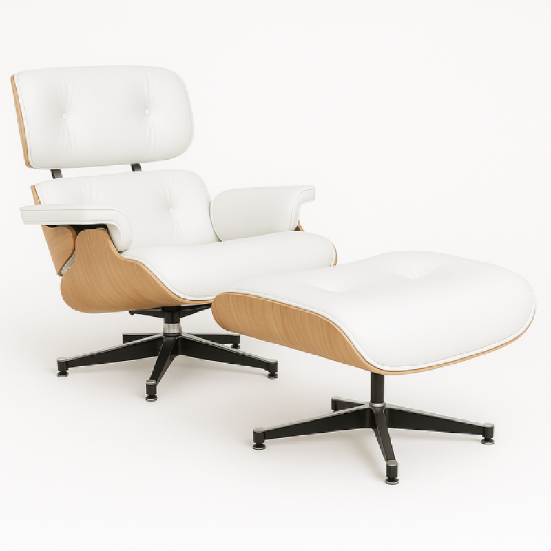 Розкішне крісло з отоманкою Релакс – це втілення архітектурного стилю сучасної епохи, королівський дизайн та максимальний комфорт із високоякісними матеріалами, якістю виготовлення за найвищими стандартами. Сидіння, спинка з підголовником та підлокітники виготовлені з 7 шарів формованої гнутої фанери, шпон колір дерева ясен, а сполучні деталі створюють унікальну форму, матеріал оббивки натуральна шкіра. Подушки сидінь з'єднані за допомогою чорної застібки, яка вшита по зовнішньому краю, для амортизації використовуються гумові шайби. Внутрішня підтримка забезпечується за рахунок вбудованих роликів та спеціальних кілець. Крісло оснащене опорами, що амортизують, що забезпечують максимальний розкішний комфорт, і цей привабливий ефект спонукає вас поринути в відкидне сидіння. Основа – ніжки металеві чорного кольору. Крісло та отоманка широко використовуються у вітальнях та офісах та виділяється поєднанням матеріалів та дизайном. Розмір крісла 87*87*84 см, розмір отоманки 65*54*44 см.